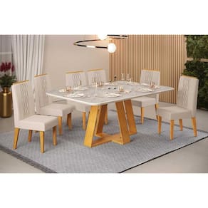 Sala de Jantar Completa Celeste c/ Tampo Madeirado Retangular 170x90cm e 6 Cadeiras Lia Cedro/Quartzo - Linho Neve - DJ Móveis