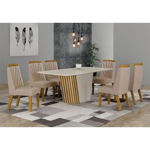 Sala de Jantar Completa com 6 Cadeiras 1,80x0,90m - Liz - Leifer Móveis Para uma sala de jantar receptiva e agradável, é preciso apostar nos móveis certos, sejam eles para as refeições do dia a dia ou para as confraternizações ao lado de familiares e amigos. Este conjunto esbanja modernidade na estrutura e design minimalista, tampo com bordas curvas, cadeiras com revestimento em tecido. Esta linda Sala de Jantar tem características ideais para dar um upgrade na sua decoração, de quebra, reunir todo mundo para momentos mais intimistas e divertidos. Confira e aproveite! Faz parte do anúncio: 1 Mesa de Jantar Liz 1,80x0,90 6 Cadeiras Liz Obs. Objetos de decoração não inclusos Particularidades da Mesa: Características: - Vidro serigrafado; - Tampo copo; - Estrutura em MDF; - Base com detalhe ripado; Particularidades da Cadeira: Características: - Bordado no encosto; - Aplique curvo superior; - Base e aplique em MDF; - Assento e encosto com espuma D28; Dimensões da Mesa: Altura: 76 centímetros Largura: 1,80 metros Profundidade: 90 centímetros Dimensões da Cadeira: Altura: 97,5 centímetros Largura: 44 centímetros Profundidade: 59 centímetros Informações Importantes:. -Produtos podem apresentar diferenças de tonalidades entre a foto na tela e o produto real, devido a calibração de cor de tela. -Limpar com flanela ou pano macio. Não utilizar álcool. Não utilizar produtos abrasivos ou corrosivos. -Nós prezamos pela qualidade da entrega em primeiro lugar, trabalhamos com transportadoras altamente selecionadas e os melhores materiais de embalagem. -A montagem é de total responsabilidade do comprador. Antes de comprar, verifique o espaço disponível para a montagem. -Certifique-se de que o produto caiba em elevadores e vãos de escadas, não fazemos içamentos. Quaisquer despesas deste tipo ficam a cargo do cliente -Garantia de 3 meses contra defeitos de fabricação.
