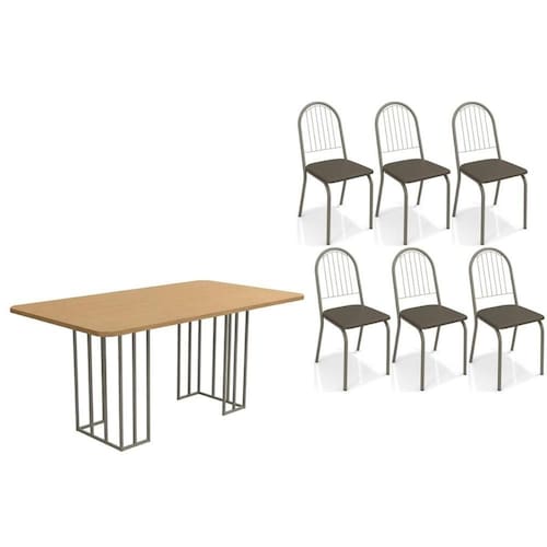 Sala de Jantar Completa Duina c/ Tampo de Madeira 160cm e 6 Cadeiras Noruega Niquel/Freijo - Courano Marrom - Kappesberg