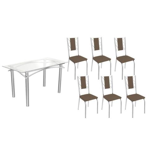 Sala de Jantar Completa Elba c/ Tampo de Vidro 150cm e 6 Cadeiras Lisboa Cromada - Courano Marrom - Kappesberg