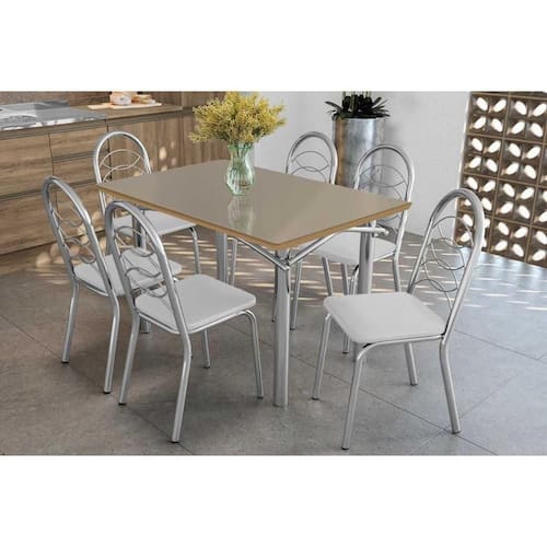 Abaixo segue os produtos do KIT: Sala de Jantar Completa Elba Tampo Madeirado c/ Vidro 120cm e 6 Cadeiras Holanda Cromada/Freijo Bronze - Courano Branco - Kappesberg