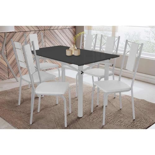 Sala de Jantar Completa Elba Tampo Madeirado c/ Vidro 120cm e 6 Cadeiras Lisboa Cromada/Preto - Courano Branco - Kappesberg Abaixo segue os produtos do KIT: Sala de Jantar Completa Elba Tampo Madeirado c/ Vidro 120cm e 6 Cadeiras Lisboa Cromada/Preto - Courano Branco - Kappesberg