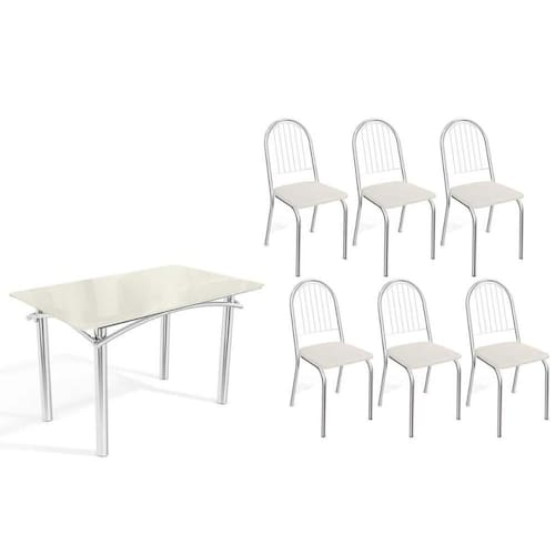 Sala de Jantar Completa Elba Tampo Madeirado c/ Vidro 120cm e 6 Cadeiras Noruega Cromada/Off White - Courano Branco - Kappesberg