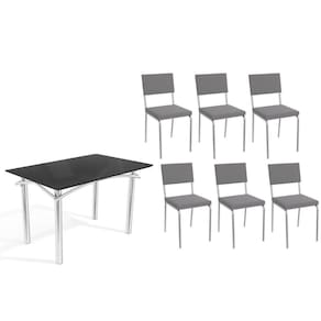 Sala de Jantar Completa Elba Tampo Madeirado c/ Vidro 120cm e 6 Cadeiras Zaria Cromada/Preto - Suede Cinza - Kappesberg Abaixo segue os produtos do KIT: Sala de Jantar Completa Elba Tampo Madeirado c/ Vidro 120cm e 6 Cadeiras Zaria Cromada/Preto - Suede Cinza - Kappesberg