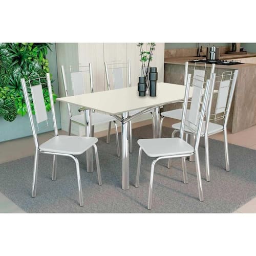 Sala de Jantar Completa Elba Tampo Madeirado c/ Vidro 160cm e 6 Cadeiras Florença Cromada/Off White - Courano Branco - Kappesberg