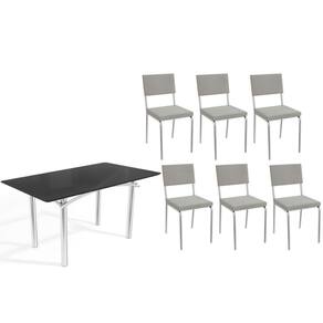 Sala de Jantar Completa Elba Tampo Madeirado c/ Vidro 160cm e 6 Cadeiras Zaria Cromada/Preto - Boucle Cinza - Kappesberg Abaixo segue os produtos do KIT: Sala de Jantar Completa Elba Tampo Madeirado c/ Vidro 160cm e 6 Cadeiras Zaria Cromada/Preto - Boucle Cinza - Kappesberg