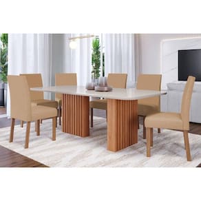 Sala de Jantar Completa Ester c/ Tampo Madeirado c/ Vidro 180x90cm e 6 Cadeiras Maia Savana-Cinamomo/Suede Gengibre Bege - Cimol