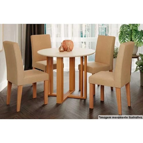 Sala de Jantar Completa Flora c/ Tampo Madeirado 93cm e 4 Cadeiras Maia Nature/Suede Gengibre Bege - Cimol