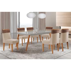 Sala de Jantar Completa Havana c/ Tampo Madeirado c/ Vidro Canto Curvo 180x90cm e 6 Cadeiras Jaspe Naturale/Off White - Suede Creme - Rufato Abaixo segue os produtos do KIT: Sala de Jantar Completa Havana c/ Tampo Madeirado c/ Vidro Canto Curvo 180x90cm e 6 Cadeiras Jaspe Naturale/Off White - Suede Creme - Rufato