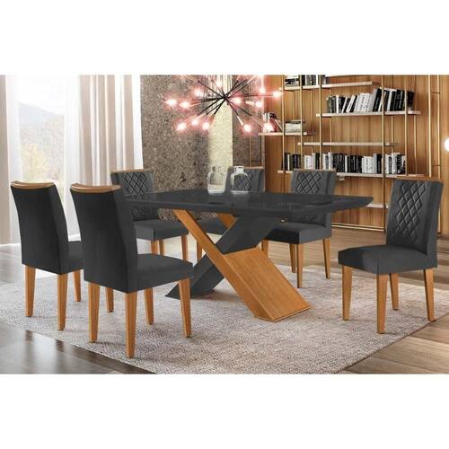 Sala de Jantar Completa Imperatriz Tampo Madeirado c/ Vidro Canto Curvo 180x90 e 6 Cadeiras Jade Imbuia/Grafite - Linho Grafite - Rufato