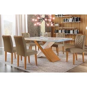 Sala De Jantar Completa Imperatriz Tampo Madeirado C/ Vidro Canto Curvo 180x90 E 6 Cadeiras Jade Imbuia/off White - Suede Capuccino - Rufato