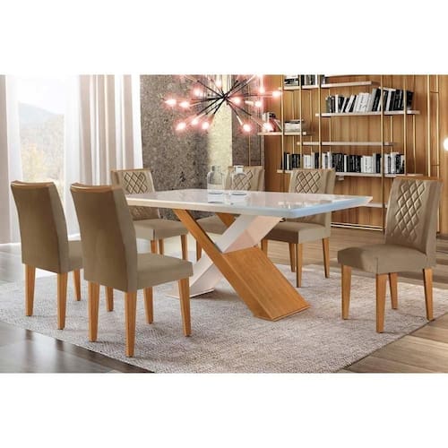 Abaixo segue os produtos do KIT: Sala de Jantar Completa Imperatriz Tampo Madeirado c/ Vidro Canto Curvo 180x90 e 6 Cadeiras Jade Imbuia/Off White - Suede Capuccino - Rufato
