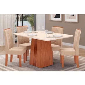 Sala de Jantar Completa Italia Tampo Madeirado c/ Vidro Curvo 170x90cm e 4 Cadeiras Zoe Freijo/Off White - Suede Creme - DJ Móveis - Blush