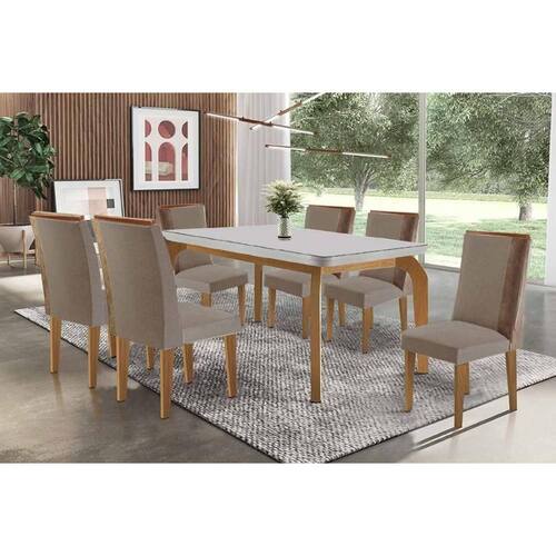 Sala de Jantar Completa Londrina c/ Tampo Madeirado c/ Vidro Canto Curvo 180x90cm e 6 Cadeiras Tilia Naturale/Off White - Suede Capuccino - Rufato Abaixo segue os produtos do KIT: Sala de Jantar Completa Londrina c/ Tampo Madeirado c/ Vidro Canto Curvo 180x90cm e 6 Cadeiras Tilia Naturale/Off White - Suede Capuccino - Rufato