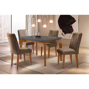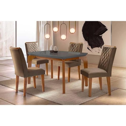 Sala de Jantar Completa Londrina c/ Tampo Madeirado Vidro Canto Curvo 120x80cm e 4 cadeiras Jade Imbuia/Grafite - Veludo Capuccino - Rufato - Blush