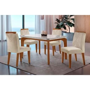 Sala de Jantar Completa Londrina Tampo Madeirado c/ Vidro Curvo 120x80 e 4 Cadeiras Amsterdã Capuccino/Suede Creme - Rufato