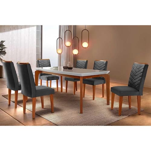 Sala de Jantar Completa Londrina Tampo Madeirado c/ Vidro Reto 180x90 e 6 Cadeiras Londrina Imbuia - Veludo Grafite - Rufato