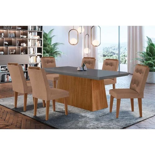 Abaixo segue os produtos do KIT: Sala de Jantar Completa Luna c/ Tampo de Vidro Canto Curvo 180x90cm e 6 cadeiras Imperatriz Imbuia/Grafite - Suede Capuccino - Rufato