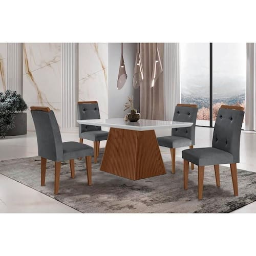Sala de Jantar Completa Luna c/ Tampo Madeirado c/ Vidro Canto Curvo 120x80cm e 4 cadeiras Imperatriz Imbuia/Off White - Suede Grafite - Rufato Abaixo segue os produtos do KIT: Sala de Jantar Completa Luna c/ Tampo Madeirado c/ Vidro Canto Curvo 120x80cm e 4 cadeiras Imperatriz Imbuia/Off White - Suede Grafite - Rufato