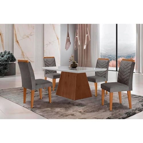 Abaixo segue os produtos do KIT: Sala de Jantar Completa Luna c/ Tampo Madeirado c/ Vidro Canto Curvo 120x80cm e 4 cadeiras Londrina Imbuia/Off White - Linho Grafite - Rufato