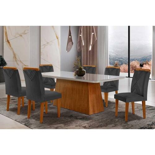 Sala de Jantar Completa Luna Tampo Madeirado c/ Vidro Canto Curvo 180x90 e 6 Cadeiras Amsterdã Imbuia/Veludo Grafite - Rufato