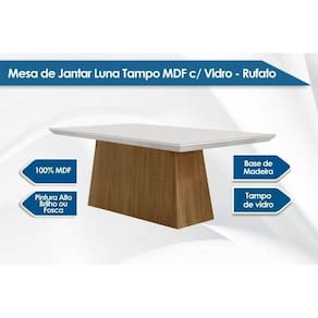 Mesa de Sala Jantar Luna + Tampo Madeirado Vidro Curvo 180x90cm Off White/Imbuia - Rufato