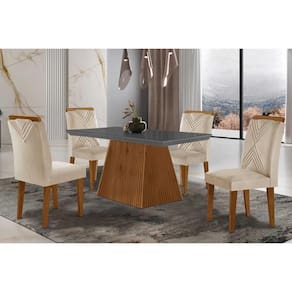 Sala de Jantar Completa Luna Tampo Madeirado c/ Vidro Curvo 120x80 e 4 Cadeiras Amsterdã Imbuia - Veludo Creme - Rufato