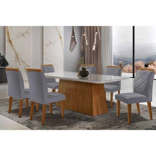Sala de Jantar Completa Luna Tampo Madeirado c/ Vidro Curvo 180x90 e 6 Cadeiras Melissa Imbuia - Veludo Grafite - Rufato
