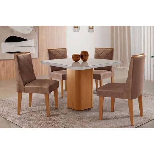 Sala de Jantar Completa Maldivas c/ Tampo Madeirado c/ Vidro Canto Curvo 90x90cm e 4 Cadeiras Pietá Naturale/Off White - Corano Capuccino - Rufato
