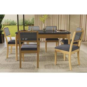 Sala de Jantar Completa Mira Premium Madeira Maciça c/ Tampo Madeirado c/ Vidro 160x90cm e 6 Cadeiras Lola Carvalho/Preto - Boucle Grafite - Kappesberg