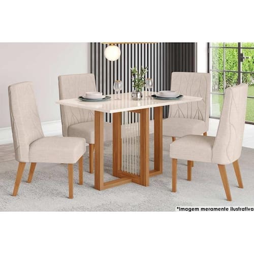 Abaixo segue os produtos do KIT: Sala de Jantar Completa Natalí c/ Tampo Madeirado c/ Vidro Reto 120x80cm e 4 Cadeiras Eloa Nature/Veludo Light Linho - Henn