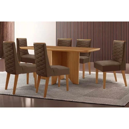 Sala de Jantar Completa Nevada c/ Tampo Madeirado Canto Curvo 180x90cm e 6 Cadeiras Dafne Naturale - Suede Marrom - Rufato Abaixo segue os produtos do KIT: Sala de Jantar Completa Nevada c/ Tampo Madeirado Canto Curvo 180x90cm e 6 Cadeiras Dafne Naturale - Suede Marrom - Rufato