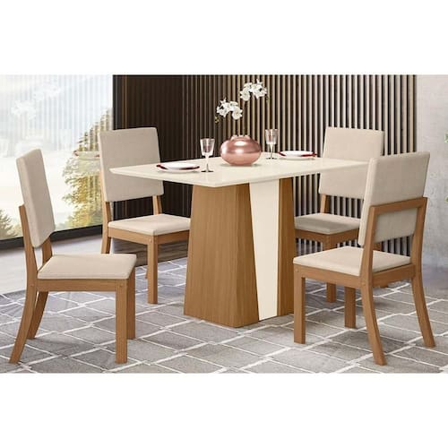 Sala de Jantar Completa Orus c/ Tampo Madeirado 120x80cm e 4 Cadeiras Milla Nature/Off White - Linho Bege - Henn