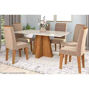 Sala de Jantar Completa Patricia c/ Tampo Madeirado c/ Vidro Canto Reto 160x80cm e 6 Cadeiras Taís Savana/Nature-Suede Pluma/Joli Capuccino - Cimol