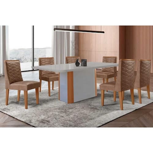 Sala de Jantar Completa Pietá c/ Tampo Madeirado c/ Vidro Canto Curvo 180x90cm e 6 Cadeiras Dafne Naturale/Off White - Corano Capuccino - Rufato Abaixo segue os produtos do KIT: Sala de Jantar Completa Pietá c/ Tampo Madeirado c/ Vidro Canto Curvo 180x90cm e 6 Cadeiras Dafne Naturale/Off White - Corano Capuccino - Rufato
