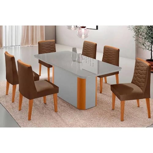 Sala de Jantar Completa Pietá c/ Tampo Madeirado c/ Vidro Canto Curvo 180x90cm e 6 Cadeiras Maldivas Naturale/Off White - Suede Marrom - Rufato Abaixo segue os produtos do KIT: Sala de Jantar Completa Pietá c/ Tampo Madeirado c/ Vidro Canto Curvo 180x90cm e 6 Cadeiras Maldivas Naturale/Off White - Suede Marrom - Rufato