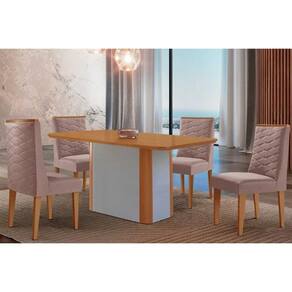 Sala de Jantar Completa Pietá c/ Tampo Madeirado Canto Curvo 120x80cm e 4 Cadeiras Dafne Naturale/Off White - Linho Capuccino - Rufato