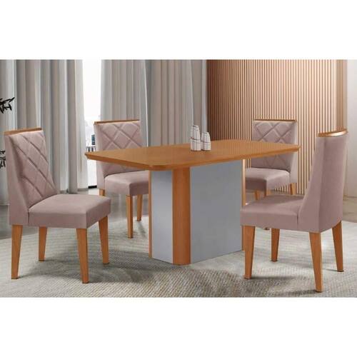 Sala de Jantar Completa Pietá c/ Tampo Madeirado Canto Curvo 120x80cm e 4 Cadeiras Pietá Naturale/Off White - Linho Capuccino - Rufato - Sala de Jantar Completa Rufato com Mesa e 4 Cadeiras