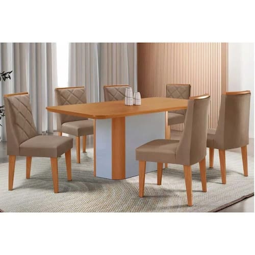 Sala de Jantar Completa Pietá c/ Tampo Madeirado Canto Curvo 180x90cm e 6 Cadeiras Pietá Naturale/Off White - Suede Capuccino - Rufato