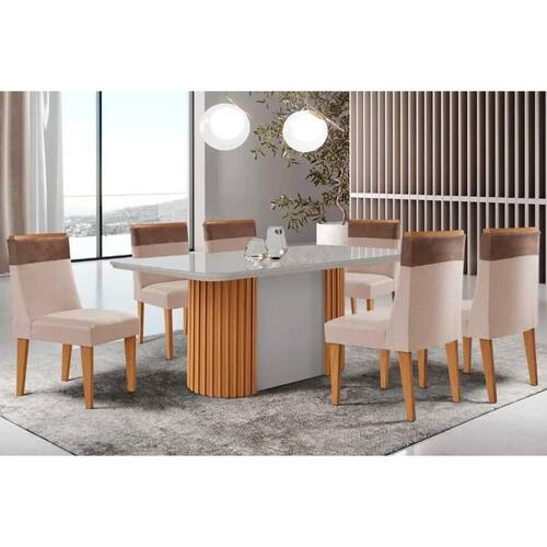 Sala de Jantar Completa Pilar c/ Tampo Madeirado c/ Vidro Canto Curvo 180x90cm e 6 Cadeiras Jaspe Naturale/Off White - Suede Creme - Rufato Abaixo segue os produtos do KIT: Sala de Jantar Completa Pilar c/ Tampo Madeirado c/ Vidro Canto Curvo 180x90cm e 6 Cadeiras Jaspe Naturale/Off White - Suede Creme - Rufato