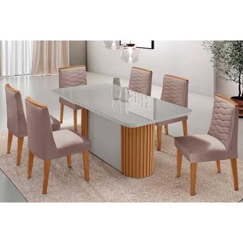 Sala de Jantar Completa Pilar c/ Tampo Madeirado c/ Vidro Canto Curvo 180x90cm e 6 Cadeiras Maldivas Naturale/Off White - Linho Capuccino - Rufato Abaixo segue os produtos do KIT: Sala de Jantar Completa Pilar c/ Tampo Madeirado c/ Vidro Canto Curvo 180x90cm e 6 Cadeiras Maldivas Naturale/Off White - Linho Capuccino - Rufato