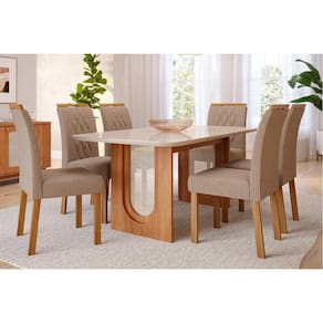Sala de Jantar Completa Valentina Tampo Madeirado c/ Vidro 180x90cm e 6 Cadeiras Juliana Cinamomo/Off White - Nature-Madeirado/Linho Be - Cimol - Blush