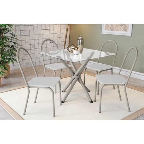 Sala de Jantar Completa Volga c/ Tampo de Vidro 90cm e 4 Cadeiras Noruega Niquel - Courano Branco - Kappesberg