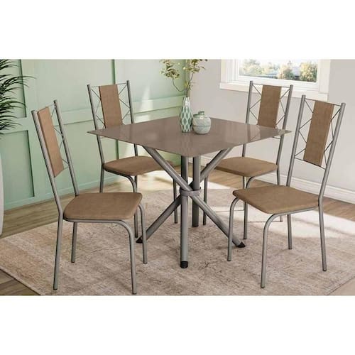Sala De Jantar Completa Volga Tampo Madeirado C/ Vidro 95x95cm E 4 Cadeiras Lisboa Niquel/freijo/vidro Bronze - Capuccino - Kappesberg