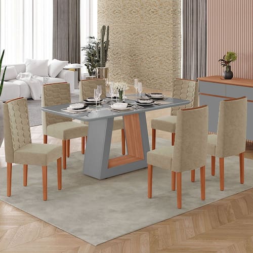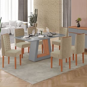 Apresentamos a Sala de Jantar Heloize com 6 Cadeiras Acolchoadas Coral. Moderna, 100% MDF o que garante durabilidade e resistência. Combina funcionalidade e estilo contemporâneo. Com tampo de vidro e cadeiras acolchoadas, é a escolha ideal para sofisticação e embelezamento de sua sala de jantar. Sua base triangular confere a peça um toque diferencial. Ideal para quem busca qualidade e estilo em sua área de refeições.