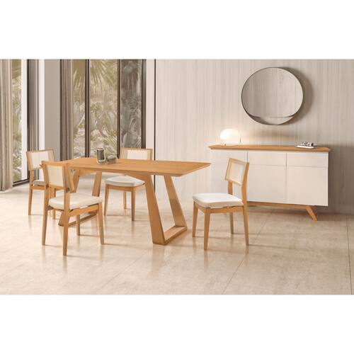 Sala de Jantar Laminada 6 Cadeiras 1,80x0,90m - Dallas - Star Móveis A Sala de Jantar Dallas é o modelo ideal para deixar sua sala mais completa, repleta de estilo e conforto. A sala é composta pela mesa Dallas que tem a estrutura em lamina de madeira Tauari e pelas cadeiras Berlim que tem a estrutura toda em madeira maciça tauari, o que aumenta sua durabilidade e resistência, com um acabamento impecável e encosto de telinha sintética que tras um charme a mais. Seu assento estofado é fabricado com espuma D-26 muito confortável, esse fabricante dispõe de várias opções de tecido, para você escolher o que melhor combina com a decoração de sua casa. Não perca tempo compre logo sua sala de jantar!! Faz parte deste ambiente: 1 Mesa de Jantar Dallas 1,80x0,90m 6 Cadeiras Berlim Obs.: Objetos de decoração não acompanham o produto. Particularidades da Sala de Jantar Completa: Características da mesa: - Fabricada em lamina de madeira Tauari; - Tampo com espessura de 40 mm; - Sapata regulavél; - A mesa vai semi montada e embalada; - Design moderno, sofisticado e diferenciado; - Madeira Ecologicamente Correta; - Baseado em conceitos sustentáveis; Dimensões da Mesa: Altura: 80 centímetros Largura: 1,80 metros Profundidade: 90 centímetros Características da Cadeira: - Estrutura em Madeira Maciça Tauari; - Encosto em Rattan; - Espuma com Densidade D-26; - Feltro de proteção nos pés; - Design moderno, sofisticado e diferenciado; - Baseado em conceitos sustentáveis; - Madeira altamente resistente; Dimensões: Altura: 90 Centímetros Largura: 48 Centímetros Profundidade: 47 Centímetros Informações Importantes: - Produtos podem apresentar diferenças de tonalidades entre a foto na tela e o produto real, devido a calibração de cor de tela. - Limpar com flanela ou pano macio. Não utilizar álcool. Não utilizar produtos abrasivos ou corrosivos. - Nós prezamos pela qualidade da entrega em primeiro lugar, trabalhamos com transportadoras altamente selecionadas e os melhores materiais de embalagem. - Todos os itens já vão embalados e a mesa vai semi montada e as cadeiras 100% montadas.Não necessita da montagem de um profissional, ficando ao critério do cliente. Não nos responsabilizamos pela montagem. - Objetos de decoração não incluso. - Certifique-se de que o produto caiba em elevadores e vãos de escadas, não fazemos içamentos ou desmontagens de produtos. Quaisquer despesas deste tipo ficam a cargo do cliente. - Garantia de 3 meses contra defeitos de fabricação. Marca: Star Móveis