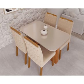 A base da Mesa Louise é uma obra de arte por si só. Feita de MDF, proporciona estabilidade excepcional, enquanto o detalhe em tela sintética adiciona um elemento de textura e elegância. O tampo de vidro temperado confere um toque de modernidade e leveza. Além de ser visualmente impressionante, o vidro temperado oferece robustez e segurança. A cadeira Paola possui assento e o encosto revestidos com estofamento de alta qualidade, proporcionando uma experiência de conforto excepcional. A inovação da Juliana também se estende ao seu sistema de montagem, que utiliza componentes Zamac. Medida da Mesa (A x L x P): 76cm x 80cm x 130cm Peso da Mesa: 48.4 Mesa suporta até: 40 Acabamento da Cadeira/Banco: Verniz Natural Acabamento da Mesa: Pintura UV Almofada do assento: Fixa Ambiente Principal: Sala de Jantar Cadeira/Banco estofada: Encosto e Assento Estofados Cadeira/Banco suporta até: 100 Complexidade da Montagem: Média: pode ser montado por mais de uma pessoa e/ou necessite de maior conhecimento para montagem Cor: Cinamomo/Off White/Madeira/Nude Cor do Produto: Cinamomo/Off White/Madeira/Nude Cor do Tampo: Off White Cor Secundária: Bege De Canto (Canto Alemão): Não Enchimento do Assento: Espuma D-18 Enchimento do Encosto: Espuma D-18 Escala de Brilho: Semi-Brilho Espessura do Tampo: 29 Espessura do Vidro: mm Estrutura do Assento: Espuma e tecido 100mm Formato do Tampo: Retangular Itens Inclusos: 1 Mesa, 4 Cadeiras, Kit Ferragens e Manual de Montagem Manual de Montagem e Instalação: https://cdn2.madeiramadeira.com.br/atributo/cimol/1708958-louise-com-wood.pdf Material da Base da Mesa: MDF Material da Estrutura da Cadeira: Madeira Material do Tampo: Vidro/MDF Medida da Base (A x L x P): . Medida da Cadeira/Banco (A x L x P): 99cm x 46cm x 57cm Medida do Tampo (L x C x E): 80cm x 130cm x 2,9cm Mesa Dobrável: Não Mesa Extensível: Não Necessita Montagem: Sim Origem do Produto: Nacional Peso da Cadeira/Banco: 9 kg Possui Apoio para Braços: Não Possui Apoio Para os Pés: Não Possui Suporte Giratório: Não Quantidade de Lugares: 04 Recomendações de Uso, Manutenção e Limpeza: Para manter seu móvel novo por muito mais tempo, evite locais úmidos, mantenha-o distante de líquidos. Para limpá-lo com segurança utilize uma flanela seca sem produtos abrasivos Revestimento da Cadeira/Banco: Suede Sistema de Montagem: Parafusos, porcas e cavilhas. Vidro Temperado: Sim
