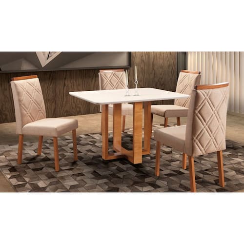 Sala de Jantar Completa com 4 Cadeiras 1,40x0,90 metros - Atlas Zurique - Art Salas A Sala de Jantar Atlas, é ideal para complementar ambientes menores, a mesa possui estrutura toda em mdf laminado de madeira maciça com tampo retangular em MDF laqueado e com vidro. As cadeiras Zurique de madeira maciça possuem assento e encosto estofados com costura no encosto. A sala de jantar possui um design moderno, sofisticado e diferenciado! Aproveite! Fazem parte do anúncio: 1 Mesa Atlas, 4 Cadeiras Zurique Obs. Objetos de decoração não inclusos Particularidades da Sala de Jantar Características da Mesa: -Estrutura em MDF laminado de madeira maciça -Vidro sobreposto de 4mm na cor Off White -Tampo retangular -Quinas arredondadas Características da Cadeira: -Estrutura em Madeira Maciça Tauari. (laminada) -Encosto e assento estofados. -Detalhe em friso na costura do encosto -Espuma com Densidade D-24 -Design moderno, sofisticado e diferenciado. -Madeira Ecologicamente Correta. -Baseado em conceitos sustentáveis. -Madeira altamente resistente. -Suporta até 150 kg distribuídos Dimensões da Mesa: Altura: 80 centímetros Largura: 1,20 metros Profundidade: 90 centímetros Dimensões da Cadeira: Altura: 1 metro Largura: 44 centímetros Profundidade: 55 centímetros Informações Importantes: - Produtos podem apresentar diferenças de tonalidades entre a foto na tela e o produto real, devido a calibração de cor de tela. - Limpar com flanela ou pano macio. Não utilizar álcool. Não utilizar produtos abrasivos ou corrosivos - Nós prezamos pela qualidade da entrega em primeiro lugar, trabalhamos com transportadoras altamente selecionadas e os melhores materiais de embalagem. - Todos os itens já vão embalados, a mesa vai semi montada e as cadeiras 100% montadas. Não necessita da montagem de um profissional, ficando ao critério do cliente. Não nos responsabilizamos pela montagem. - Certifique-se de que o produto caiba em elevadores e vãos de escadas, não fazemos içamentos ou desmontagens de produtos. Quaisquer despesas deste tipo ficam a cargo do cliente - Garantia de 3 meses contra defeitos de fabricação. Marca: Art Salas