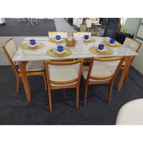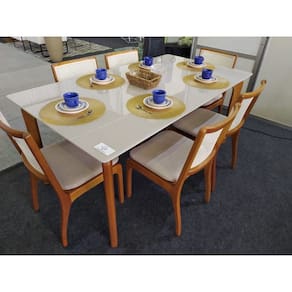 Sala de Jantar Madeira Maciça com vidro 6 Cadeiras 1,80x1,0m - Esparta - Requinte Salas Esta sala de jantar traz uma opção a mais para complementar sua decoração. Uma mesa que possui um design contemporâneo, sua base tem um design moderno com um visual clean. A Mesa Esparta é a pedida certa para você deixar sua casa mais moderna. Tem base em madeira maciça Tauari e tampo em MDF laminado. As cadeiras Barcelona possuem um design moderno e um acabamento muito delicado, que vai trazer ao seu ambiente um ar sofisticado e elegante! As cadeiras tem a estrutura em madeira maciça tauari, madeira ecologicamente correta, e o seu encosto com detalhe em telinha de fibra natural. Quanto a durabilidade, esse modelo não deixa nada a desejar, o seu assento é fabricado com espuma de densidade D-26, muito confortável, e as cadeiras suportam ate 150Kg distribuídos. Se você procura uma cadeira elegante e moderna, esse modelo é perfeito!! Aproveite! Não perca tempo e compre logo a sua sala de jantar. Fazem parte do anúncio 1 Mesa de Jantar Esparta 6 Cadeiras Barcelona Obs. Objetos de decoração não inclusos. Particularidades da Sala de Jantar Características da Mesa: - Base em madeira maciça Tauari; - Tampo em MDF laminado; - Tampo retangular; - Madeira ecologicamente correta. Características da Cadeira: - Madeira Maciça Tauari seca em estufa; - Madeira imunizada; - Espuma D-26 no assento; - Encosto com telinha (Rattan) de fibra natural; - Estrutura reforçada; - Ecologicamente correta; - Peso suportado 150kg; Dimensões da Mesa: Altura: 79 centímetros Largura: 1,80 metros Profundidade: 1,0 metro Dimensões da Cadeira: Altura: 86 centímetros Largura: 47 centímetros Profundidade: 54 centímetros Informações Importantes: - Produtos podem apresentar diferenças de tonalidades entre a foto na tela e o produto real, devido a calibração de cor de tela. - Limpar com flanela ou pano macio. Não utilizar álcool. Não utilizar produtos abrasivos ou corrosivos. - Nós prezamos pela qualidade da entrega em primeiro lugar, trabalhamos com transportadoras altamente selecionadas e os melhores materiais de embalagem. - As cadeiras vão montadas nas caixas e embaladas. Necessário fixar o assento e o encosto e parafusar, não necessita da montagem de um profissional. A mesa vai semi montada, necessário fixar o tampo a base. - Objetos de decoração não incluso. - Certifique-se de que o produto caiba em elevadores e vãos de escadas, não fazemos içamentos ou desmontagens de produtos. Quaisquer despesas deste tipo ficam a cargo do cliente. - Garantia de 3 meses contra defeitos de fabricação. Marca: Não Informado