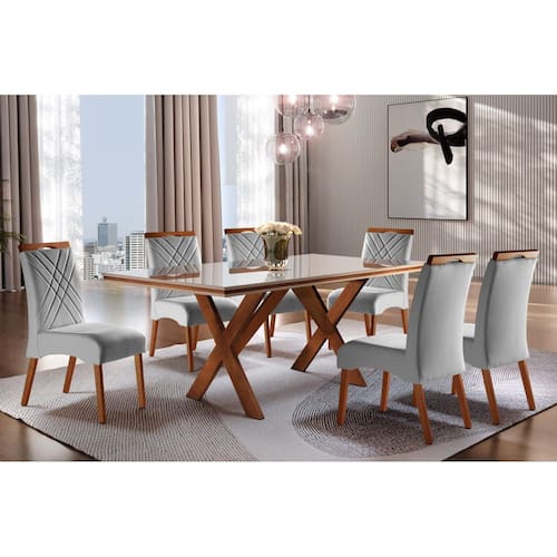 Sala de Jantar Madeira Maciça com 6 cadeiras 2,0x1,0m - Jade - Requinte Salas A mesa de jantar Nobre tem um design individualizado, que une modernidade, beleza e sofisticação, produzida com os materiais da mais alta qualidade para atender bem os seus usuários. Ela tem a estrutura da base em madeira maciça Tauari, ecologicamente correta, o tampo em MDF 45mm de espessura, vidro de 3mm sobreposto, e quinas canto tick que traz uma modernidade a mais. Um escândalo de elegância junto das cadeiras Alfa! As cadeiras Alfa esbanjam elegância e charme para deixar sua sala de jantar completa e moderna! Elas contam com um encosto todo estofado com detalhes em costura, e um pegador em madeira maciça, que proporcionam um charme a mais a esse modelo. O assento é fabricado com espuma de densidade D-23 e D-20 no encosto, reforçando o conforto do produto. Sua estrutura é toda em madeira maciça tauari, ecologicamente correta. Perfeitas, não é mesmo? Aproveite! Fazem parte do anúncio 1 Mesa de Jantar Nobre 6 Cadeiras Alfa Obs. Objetos de decoração não inclusos. Particularidades da Sala de Jantar Características da Mesa: - Base em madeira maciça Tauari seca em estufa e imunizada - Madeira ecologicamente correta - Tampo em MDF com 45mm de espessura - Vidro 3mm - Tampo retangular com quinas retas Características da Cadeira: - Madeira Tauari seca em estufa - Madeira imunizada - Espuma D-23 no assento - Espuma D-20 no encosto - Estrutura reforçada - Ecologicamente correta - Peso suportado 150kg Dimensões da Mesa: Altura: 76 centímetros Largura: 2,0 metros Profundidade:1 metro Dimensões da Cadeira: Altura: 1 metro Largura: 47 centímetros Profundidade: 54 centímetros Informações Importantes: - Produtos podem apresentar diferenças de tonalidades entre a foto na tela e o produto real, devido a calibração de cor de tela. - Limpar com flanela ou pano macio. Não utilizar álcool. Não utilizar produtos abrasivos ou corrosivos - Nós prezamos pela qualidade da entrega em primeiro lugar, trabalhamos com transportadoras altamente selecionadas e os melhores materiais de embalagem. - Todos os itens já vão embalados, a mesa vai semi montada e as cadeiras 100% montadas. Não necessita da montagem de um profissional, ficando ao critério do cliente. Não nos responsabilizamos pela montagem. - Objetos de decoração não incluso. - Certifique-se de que o produto caiba em elevadores e vãos de escadas, não fazemos içamentos ou desmontagens de produtos. Quaisquer despesas deste tipo ficam a cargo do cliente - Garantia de 3 meses contra defeitos de fabricação. Marca: Requinte Salas